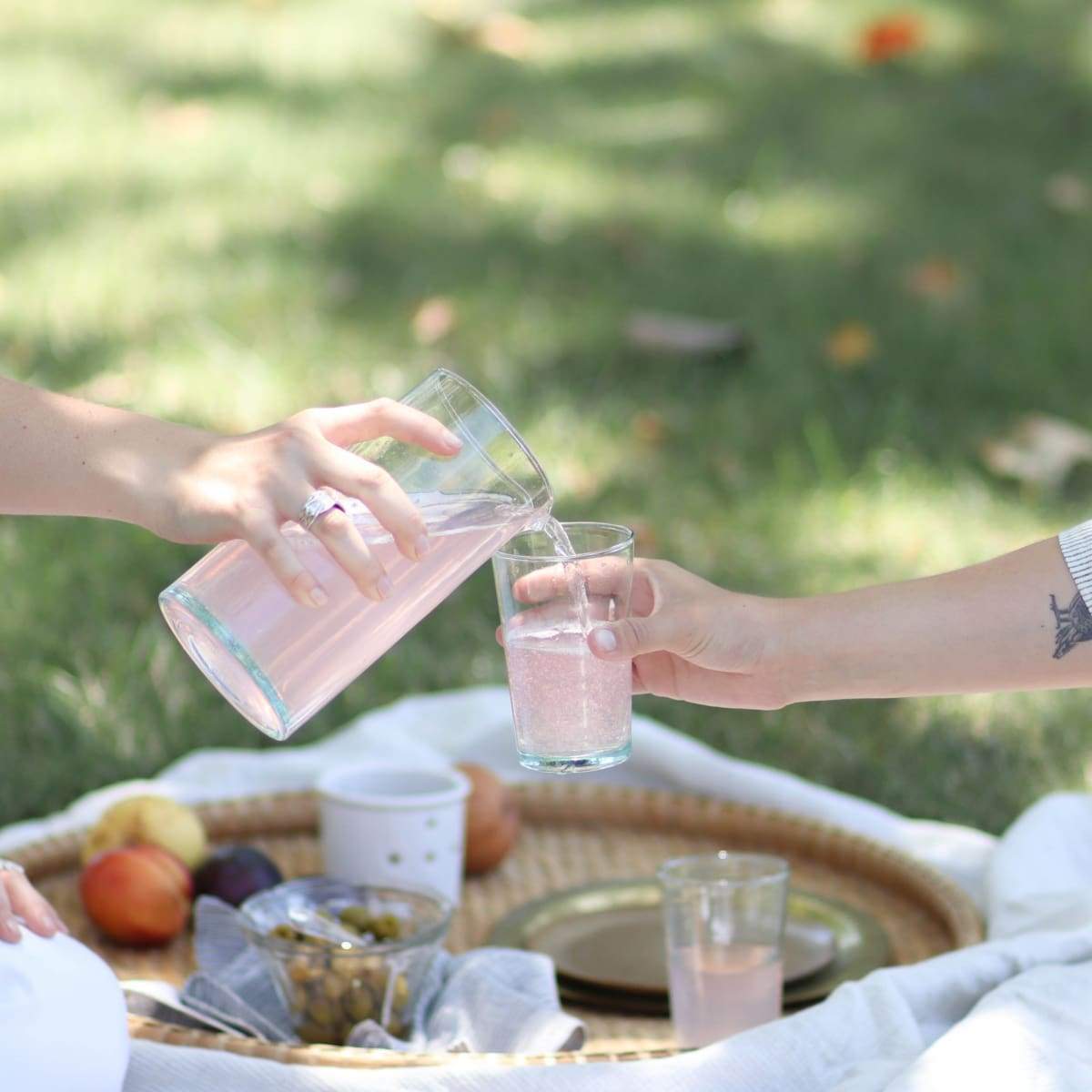 We love the pretty color of classic Moroccan glassware which comes from the perfect combination of recycled glass bottles, a little blue, a little green, a little clear, and voila! The prettiest blue you could imagine. We've added these two carafes to our collection of tea glasses because, why not? Use them as a water carafe, a wine decanter or even as a vase.